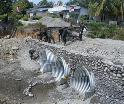Langkat – TNI Satgas Penanggulangan Bencana Alam (Gulbencal) Kodam I/Bukit Barisan melalui Kodim 0203/Langkat terus mempercepat pembangunan jembatan tipe Aramco di Desa Sei Litur Tasik, Kecamatan Sawit Seberang, Kabupaten Langkat.
